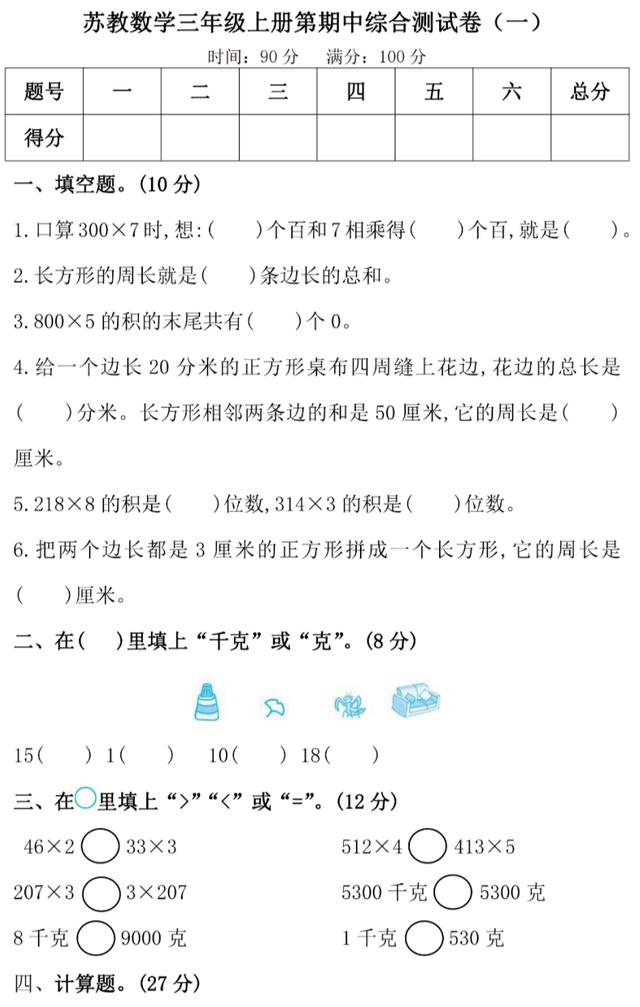 苏教版数学三年级上册期中测试卷3 含答案 小初高题库试卷课件教案网
